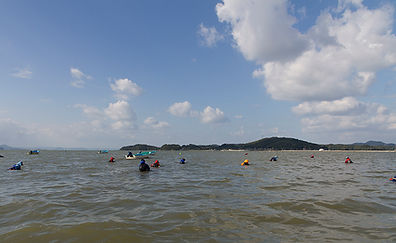 それを持って2回目の試し掘りです。この日は前回の漁場より河口側に200mほど移動したポイント。天気は良いですが、ちょっと風があって内湾とはいえ波立ってます。しゃがみ込んで掘ってるとたまに顔まで波を食らいそうですが、まあみなさん普通に掘り始めました。でも女性とかおじいちゃん達は膝下ぐらいの比較的浅い場所、ちょっと体力あるおっちゃんは腿ぐらいの場所で 掘ってますから、そのへんの影響はあるのでしょうか。